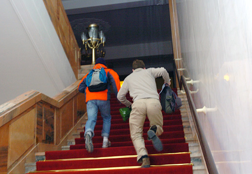 3月5日上午9時(shí),第十一屆全國人民代表大會(huì)第一次會(huì)議在人民大會(huì)堂開幕,聽取國務(wù)院總理溫家寶作政府工作報(bào)告,審查年度計(jì)劃報(bào)告和預(yù)算報(bào)告。圖為外國記者為搶占位置在大會(huì)堂樓梯上奔跑。
