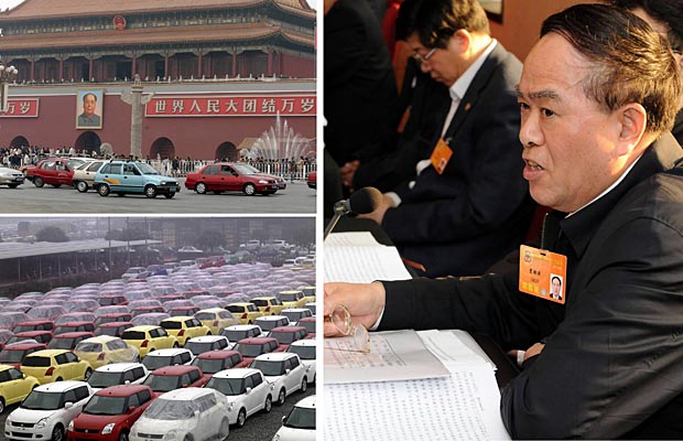 小排量轎車行駛在北京長安街上(左上圖)。整裝待發(fā)的長安汽車集團小排量汽車(右下圖)。新華社發(fā)