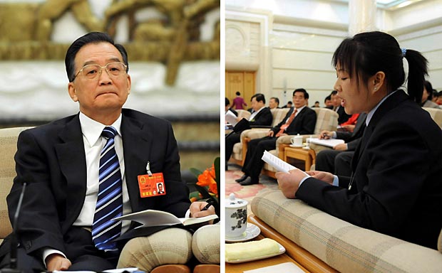 3月7日,中共中央政治局常委、國務(wù)院總理溫家寶參加十一屆全國人大一次會議廣東代表團的審議。來自廣東佛山的農(nóng)民工代表胡小燕(右圖)發(fā)言時說:“農(nóng)民工最關(guān)心的事情就是擔(dān)心留在家鄉(xiāng)的孩子每天是不是吃飽了飯,穿暖了衣,上學(xué)的路上是不是安全……”,溫家寶總理聽胡小燕發(fā)言時表情凝重(左圖)。聽完胡小燕的發(fā)言,溫家寶總理說:“你關(guān)心的問題,也是我關(guān)心的問題!