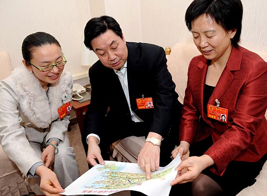 | 圖為來(lái)自河南的趙素萍代表(右)、來(lái)自甘肅的張津梁代表(中)和畢紅珍代表(左)在一起討論建議規(guī)劃建設(shè)線路示意圖。 |