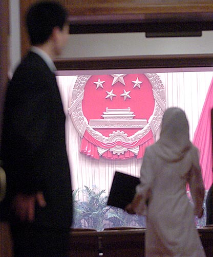 2008年3月10日上午9時(shí),第十一屆全國人民代表大會(huì)第一次會(huì)議在人民大會(huì)堂舉行第三次全體會(huì)議,聽取最高人民法院院長肖揚(yáng)作最高人民法院工作報(bào)告;聽取最高人民檢察院檢察長賈春旺作最高人民檢察院工作報(bào)告。圖為一名代表正在步入會(huì)場。