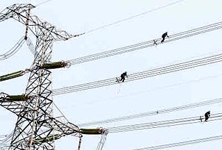 | 年初,杭州電網(wǎng)遭受冰雪災(zāi)害破壞。圖為電力職工正在修復(fù)最后一條受損線路。施健學(xué)