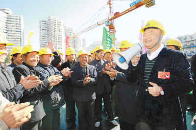 3月13日,十一屆全國人大一次會(huì)議代表休息日。上午9點(diǎn)多,來自河南的全國人大代表、相聲演員范軍來到位于北京市北三環(huán)的一處工地,看望在這里打工的河南籍民工,了解他們的生活、工作情況,并收集創(chuàng)作素材。趁著工友們午休時(shí)候,范軍代表還即興表演了幾個(gè)相聲段子,把大伙逗得開懷大笑。
