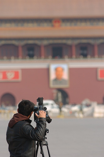 3月14日,中國(guó)人民政治協(xié)商會(huì)議第十一屆全國(guó)委員會(huì)第一次會(huì)議在北京人民大會(huì)堂舉行閉幕會(huì)。圖為當(dāng)日一名電視記者在廣場(chǎng)上拍攝外景。