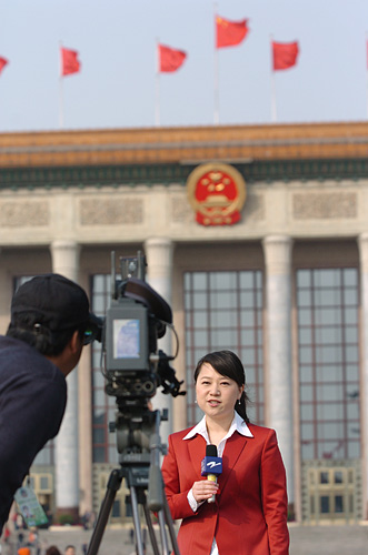 3月14日,中國(guó)人民政治協(xié)商會(huì)議第十一屆全國(guó)委員會(huì)第一次會(huì)議在北京人民大會(huì)堂舉行閉幕會(huì)。圖為當(dāng)日電視記者在廣場(chǎng)上做現(xiàn)場(chǎng)報(bào)道。