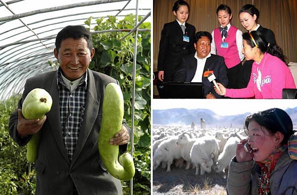 “阿里也有西瓜、蘋果?”聽了達(dá)娃扎西代表的介紹,在場的人無不感到驚奇。 面積34萬平方公里、人口僅8萬多的西藏阿里地區(qū)平均海拔5000米以上,因離“天”最近而被稱為“天上的阿里”。但因它寒冷缺氧、環(huán)境惡劣,長久以來又被稱為“生命禁區(qū)”。然而,阿里行署專員達(dá)娃扎西代表卻用事實(shí)告訴人們:如今,阿里與全國一樣發(fā)生了巨大變化。 聽說達(dá)娃扎西代表要向記者介紹“天上的阿里”,一些賓館工作人員也好奇地聚集過來。 “去年阿里地區(qū)農(nóng)牧民西瓜、蘋果的收入就有100多萬元!边_(dá)娃扎西介紹,近年來阿里大力發(fā)展白絨山羊養(yǎng)殖、神山圣湖礦泉水生產(chǎn)、無公害果蔬種植,以及旅游業(yè)、特色優(yōu)礦產(chǎn)業(yè)開發(fā)等,去年地區(qū)生產(chǎn)總值突破14億元,比5年前增加了兩倍,農(nóng)牧民人均純收入連續(xù)5年保持兩位數(shù)增長,去年達(dá)到2483元。 “你們看,這就是白絨山羊,一只羊的毛絨能賣2000多元,全地區(qū)1100多個示范戶光靠這‘軟黃金’去年總收入就有3億多元。”達(dá)娃扎西點(diǎn)擊著電腦上的一張張圖片介紹說,古格王國遺址、扎達(dá)土林風(fēng)光、神山圣湖等古跡和自然美景也吸引著越來越多的游客。農(nóng)牧民通過牦牛運(yùn)輸、家庭旅館等方式也賺了不少“現(xiàn)票票”。 “我們阿里生存環(huán)境相對來說是有點(diǎn)苦,但在全國人民的關(guān)心幫助下,日子越過越有希望。”達(dá)娃扎西說,“隨著阿里機(jī)場的興建、新藏公路的改擴(kuò)建等大型工程上馬,阿里會迎來更大的變化,群眾也將會有更多的致富機(jī)會。” “真是想不到,阿里竟然這么美,群眾也過上了好日子!睅酌e館工作人員嘖嘖稱奇。 聽到這話,達(dá)娃扎西高興地說:“我代表阿里人民歡迎大家來阿里觀光!” 右上圖:全國人大代表達(dá)娃扎西在介紹阿里發(fā)生的巨大變化。 右下圖:西藏阿里地區(qū)日土縣藏族牧羊女次仁珠吉放牧著被譽(yù)為能產(chǎn)“軟黃金”的白絨山羊(資料照片)。 左圖:西藏阿里地區(qū)普蘭縣農(nóng)民歐珠在展示海拔3800多米的太陽能溫室種出的蔬菜(資料照片)。 |