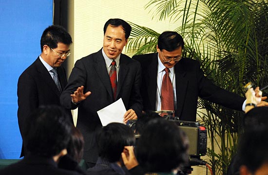 | 3月14日,銀監(jiān)會(huì)有關(guān)負(fù)責(zé)人、部分全國(guó)人大代表在北京兩會(huì)新聞中心就“銀行業(yè)支持‘三農(nóng)’和小企業(yè)發(fā)展工作情況”接受中外記者的集體采訪。這是銀監(jiān)會(huì)副主席王兆星(中)在采訪結(jié)束后向記者致意。新華社記者