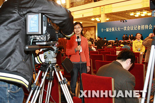 3月18日上午8時(shí)30分,人民大會堂三樓記者席已是“座無虛席”。這是電視記者在現(xiàn)場試鏡。
