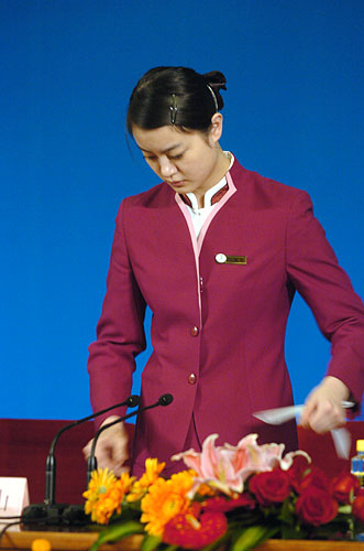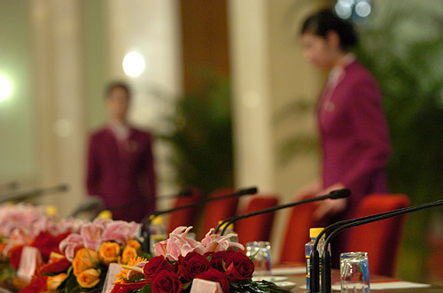 3月18日上午十一屆全國人大一次會議閉幕后,國務(wù)院總理溫家寶在人民大會堂三樓中央大廳與采訪十一屆全國人大一次會議的中外記者見面并回答記者提出的問題。圖為工作人員在作準(zhǔn)備。
