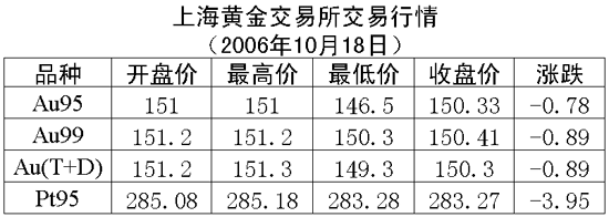 18日,上海黃金交易所各個交易品種全線下跌,黃金Au99.95收盤于150.33元/克,下跌0.78元/克,共成交2242公斤;黃金Au99.99收盤于150.41元/克,下跌0.89元/克,共成交548.60公斤;鉑金Pt99.95收盤于283.27元/克,下跌3.95元/克,共成交48公斤;黃金Au(T+D)延期交易品種收盤于150.30元/克,下跌0.89元/克,共成交2382公斤。