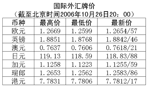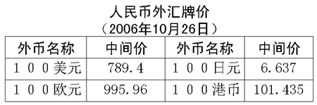 根據(jù)中國人民銀行授權(quán)中國外匯交易中心發(fā)布的公告,2006年10月26日銀行間外匯市場美元等交易貨幣對人民幣匯率的中間價為:1美元兌人民幣7.8940元,1歐元兌人民幣9.9596元,100日元兌人民幣6.6370元,1港元兌人民幣1.01435元,1英鎊兌人民幣14.8356元。