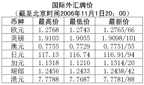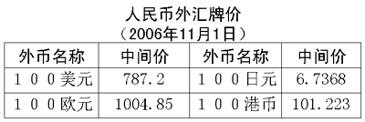 中國人民銀行授權(quán)中國外匯交易中心公布,2006年11月1日銀行間外匯市場美元等交易貨幣對人民幣匯率的中間價(jià)為:1美元對人民幣7.8720元,1歐元對人民幣10.0485元,100日元對人民幣6.7368元,1港元對人民幣1.01223元,1英鎊對人民幣15.0200元。