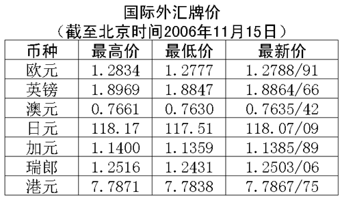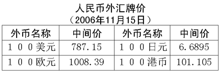 根據(jù)中國人民銀行授權(quán)中國外匯交易中心發(fā)布的公告,2006年11月15日銀行間外匯市場美元等交易貨幣對人民幣匯率的中間價為:1美元兌人民幣7.8715元,1歐元兌人民幣10.0839元,100日元兌人民幣6.6895元,1港幣兌人民幣1.01105元,1英鎊兌人民幣14.9251元。