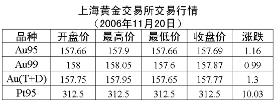 20日,上海黃金交易所黃金Au99.95收盤于157.69元/克,上漲1.16元/克,共成交1980公斤;黃金Au99.99收盤于157.87元/克,上漲0.99元/克,共成交440.80公斤;鉑金Pt99.95收盤于312.50元/克,上漲10.03元/克,共成交4公斤;黃金Au(T+D)延期交易品種收盤于157.77元/克,上漲1.30元/克,共成交1132公斤。