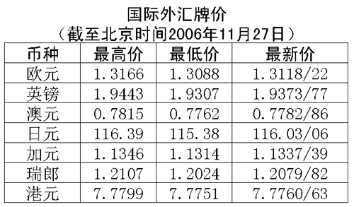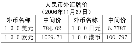 根據(jù)中國人民銀行授權(quán)中國外匯交易中心發(fā)布的公告,2006年11月27日銀行間外匯市場美元等交易貨幣對人民幣匯率的中間價為:1美元兌人民幣7.8402元,1歐元兌人民幣10.2971元,100日元兌人民幣6.7787元,1港幣兌人民幣1.00797元,1英鎊兌人民幣15.2001元。在自動撮合交易系統(tǒng),美元收于人民幣7.8428元,低于24日收盤時的7.8506元,盤中交易區(qū)為人民幣7.8432-7.8406元。在詢價交易市場,美元收于人民幣7.8436元,低于24日收盤時的7.8525元,盤中交易區(qū)為人民幣7.8441-7.8410元。