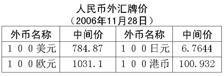 根據(jù)中國人民銀行授權(quán)中國外匯交易中心發(fā)布的公告,2006年11月28日銀行間外匯市場美元等交易貨幣對人民幣匯率的中間價為:1美元兌人民幣7.8487元,1歐元兌人民幣10.3110元,100日元兌人民幣6.7644元,1港幣兌人民幣1.00932元,1英鎊兌人民幣15.2166元。