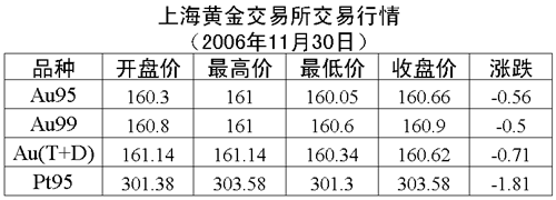 11月30日,上海黃金交易所黃金Au99.95收盤于160.66元/克,下跌0.56元/克,共成交1524公斤;黃金Au99.99收盤于160.90元/克,下跌0.50元/克,共成交500.40公斤;鉑金Pt99.95收盤于303.58元/克,下跌1.81元/克,共成交104公斤。黃金Au(T+D)延期交易品種收盤于160.62元/克,下跌0.71元/克,共成交1916公斤。