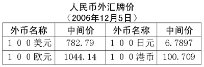 根據(jù)中國人民銀行授權(quán)中國外匯交易中心發(fā)布的公告,2006年12月5日銀行間外匯市場美元等交易貨幣對人民幣匯率的中間價(jià)為:1美元兌人民幣7.8279元,1歐元兌人民幣10.4414元,100日元兌人民幣6.7897元,1港幣兌人民幣1.00709元,1英鎊兌人民幣15.4885元。