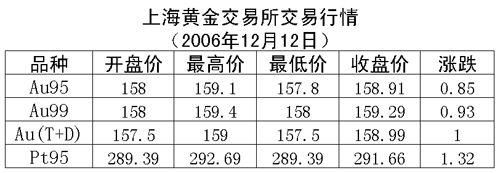 12日,上海黃金交易所黃金Au99.95收盤于158.91元/克,上漲0.85元/克,共成交2284公斤;黃金Au99.99收盤于159.29元/克,上漲0.93元/克,共成交299.80公斤;鉑金Pt99.95收盤于291.66元/克,上漲1.32元/克,共成交310公斤。黃金Au(T+D)延期交易品種收盤于158.99元/克,上漲1.00元/克,共成交2612公斤。白銀Ag(T+D)延期交易品種收盤于3867.00元/公斤,上漲86元/公斤,共成交144公斤。