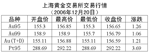20日上海黃金交易所黃金Au99.95收盤于156.65元/克,上漲1.26元/克,共成交2082公斤;黃金Au99.99收盤于156.79元/克,上漲1.06元/克,共成交410.40公斤;鉑金Pt99.95收盤于292.22元/克,上漲3.69元/克,共成交150公斤。黃金Au(T+D)延期交易品種收盤于156.59元/克,上漲1.21元/克,共成交2928公斤。