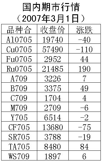 3月1日(周四),國(guó)內(nèi)期貨市場(chǎng)金屬下跌,能源類(lèi)上漲。倫敦銅周三下跌25美元/噸,收盤(pán)6050美元/噸。滬銅704合約周四下跌200元/噸,收盤(pán)57540元/噸。倫敦鋁周三下跌17.5美元/噸,收盤(pán)2827美元/噸。滬鋁705合約周四下跌40元/噸,收盤(pán)19740元/噸。