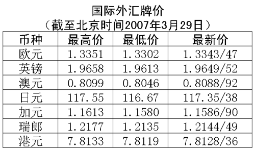 根據(jù)中國人民銀行授權(quán)中國外匯交易中心發(fā)布的公告,2007年3月29日銀行間外匯市場(chǎng)美元等交易貨幣對(duì)人民幣匯率的中間價(jià)為:1美元兌人民幣7.7303元,1歐元兌人民幣10.2906元,100日元兌人民幣6.6195元,1港幣兌人民幣0.98942元,1英鎊兌人民幣15.1783元。