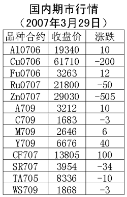 3月29日國(guó)內(nèi)期貨市場(chǎng)鋁、燃油、豆類價(jià)格上漲,其余品種下跌。滬銅706合約周四下跌200元/噸,收盤61710元/噸,支撐價(jià)位61000元一線,上漲壓力65000元一線。滬鋁706合約周四上漲10元/噸,收盤19340元/噸,支撐19200元一線,上漲壓力19800元一線。