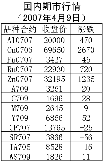 4月9日國內(nèi)期貨市場白糖下跌,金屬、能源、農(nóng)產(chǎn)品價(jià)格全部飄紅。倫敦、美國市場上周五因復(fù)活節(jié)休市。滬銅706合約周一上漲2670元/噸,收盤69650元/噸,支撐價(jià)位68000元一線,上漲壓力71500元一線。滬鋁706合約周一上漲360元/噸,收盤19860元/噸,支撐19600元一線,上漲壓力20300元一線。