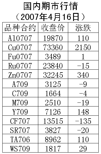 4月16日國內(nèi)期貨市場金屬價格上漲。倫敦銅上周五上漲72.5美元/噸,收盤7732.5美元/噸。滬銅707合約周一上漲2150元/噸,收盤73360元/噸。
