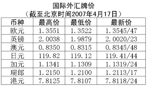 根據(jù)中國人民銀行授權(quán)中國外匯交易中心發(fā)布的公告,2007年4月17日銀行間外匯市場(chǎng)美元等交易貨幣對(duì)人民幣匯率的中間價(jià)為:1美元兌人民幣7.7308元,1歐元兌人民幣10.4625元,100日元兌人民幣6.4647元,1港幣兌人民幣0.98964元,1英鎊兌人民幣15.3827元。