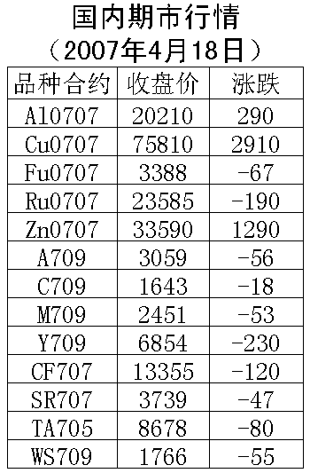 18日國內(nèi)期貨市場金屬上漲,能源、農(nóng)產(chǎn)品價格下跌。倫敦銅周二上漲315美元/噸,收盤8085美元/噸。滬銅707合約周三上漲2910元/噸,收盤75810元/噸達到漲停板,明日漲跌幅度擴大到5%,支撐價位73000元一線,上漲壓力80000元一線。倫敦鋁周二上漲52美元/噸,收盤2885美元/噸。滬鋁707合約周三上漲290元/噸,收盤20210元/噸,支撐價位20000元一線,上漲壓力20400元一線。