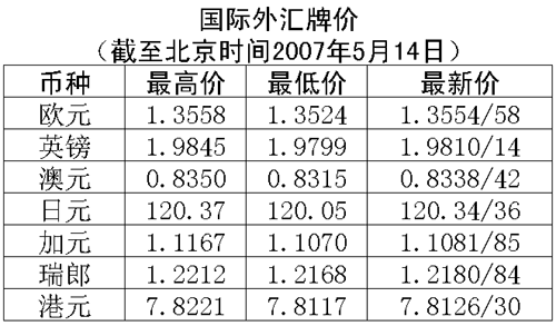 根據(jù)中國人民銀行授權(quán)中國外匯交易中心發(fā)布的公告,2007年5月14日銀行間外匯市場美元等交易貨幣對人民幣匯率的中間價為:1美元兌人民幣7.6739元,1歐元兌人民幣10.3866元,100日元兌人民幣6.3861元,1港幣兌人民幣0.98161元,1英鎊兌人民幣15.2150元。