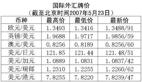 根據(jù)中國人民銀行授權中國外匯交易中心發(fā)布的公告,2007年5月23日銀行間外匯市場美元等交易貨幣對人民幣匯率的中間價為:1美元兌人民幣7.6540元,1歐元兌人民幣10.2942元,100日元兌人民幣6.2918元,1港幣兌人民幣0.97838元,1英鎊兌人民幣15.1151元。