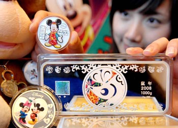 | 中國印鈔造幣總公司發(fā)行的“福鼠賀歲”鼠年生肖金銀條和“迪士尼2008米奇紀(jì)念章”。新華社發(fā) | 銀條類藏品頻繁亮相