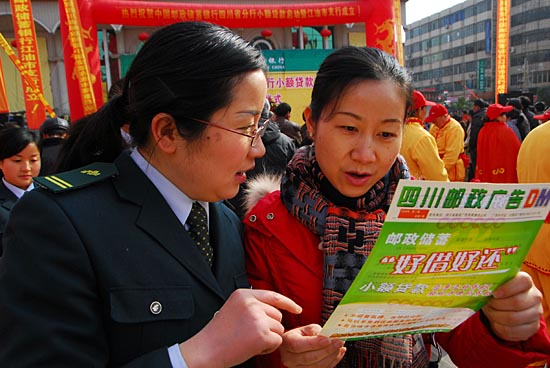 1月31日,中國郵政儲蓄銀行江油市支行工作人員(左)正在向一名當(dāng)?shù)貍體工商戶陳女士介紹小額貸款業(yè)務(wù)。 當(dāng)日,中國郵政儲蓄銀行四川省分行正式啟動小額貸款業(yè)務(wù)試點。這是繼郵政儲蓄存單質(zhì)押貸款之后,中國郵政儲蓄為廣大小企業(yè)主和農(nóng)戶開辟的一個新的貸款渠道,有望2008年在四川全省推廣。 | |