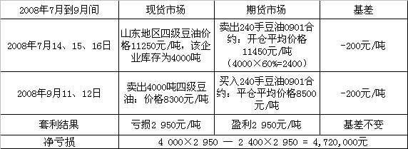 讓我們來分析發(fā)生在2008年的四個不同的套期保值實戰(zhàn)案例。 在保值虧損的案例一中,雖然廣東那家保值企業(yè)完全遵守了傳統(tǒng)的套期保值原則,但因為企業(yè)對大勢判斷失誤,在現(xiàn)貨價格相對于目標(biāo)保值期貨價格已經(jīng)產(chǎn)生較大價差的情況下,依舊采用1:1的保值方案,結(jié)果造成沒有對所有現(xiàn)貨進行有效保護。 案例二中的天津某企業(yè)則表現(xiàn)出對大勢把握比較準(zhǔn)確的操作思路。當(dāng)時,油脂價格處于上升勢頭中,現(xiàn)貨銷售比較容易,該天津油脂企業(yè)在期市上建立了小于現(xiàn)貨庫存數(shù)量的空頭頭寸數(shù)量。由于沒有建立完全數(shù)量的保值,企業(yè)在期市的虧損小于現(xiàn)貨市場上的盈利,從最終的保值效果看,企業(yè)實現(xiàn)了盈利。 在案例三中,山東某企業(yè)雖然對大勢把握準(zhǔn)確,已經(jīng)認定了熊市的到來,但因為他們僅對60%的庫存數(shù)進行了期市上的空頭保值,再加上當(dāng)時處在價格加速下行時期,現(xiàn)貨銷售比較困難,使得另外40%的庫存處于敞口風(fēng)險當(dāng)中,期市上的空頭頭寸只給企業(yè)規(guī)避了部分庫存風(fēng)險,最終企業(yè)出現(xiàn)了不應(yīng)有的虧損。 在避險成功的案例四中,河北的這家企業(yè)不僅看準(zhǔn)了走熊的大勢,而且在期市上建立了大于現(xiàn)貨庫存的空頭頭寸,企業(yè)在當(dāng)時市價銷售庫存較為困難的情況下,為了能在兩個市場同時進行交易了結(jié),以低于市價將庫存逐步消化,結(jié)局比較完美,除去兩市盈虧相抵的部分,企業(yè)在期市上建立的超額部分保值頭寸給他們帶來了超額收益。