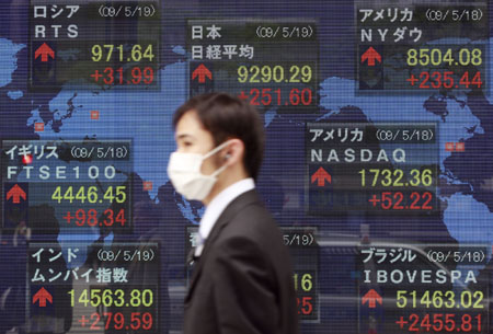 5月19日,在日本首都東京,一名行人從一塊日經(jīng)股指顯示牌前走過(guò)。當(dāng)日,受前一交易日紐約股市大幅上漲等因素影響,東京股市日經(jīng)225種股票平均價(jià)格指數(shù)比前一個(gè)交易日上漲251.60點(diǎn),收于9290.29點(diǎn),上漲2.78%。
