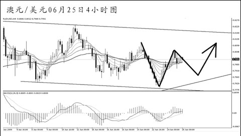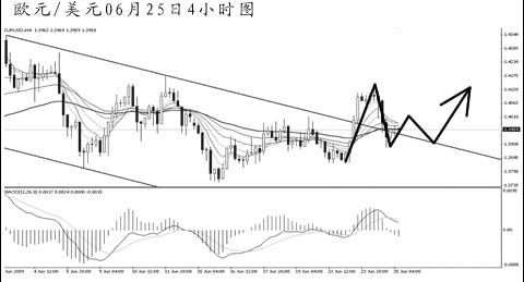 ▲美元兌日元短線小幅創(chuàng)出新低之后反彈,圖中的下降通道為經(jīng)驗性畫法,上沿的阻力在96.50一線。預計美日仍將保持震蕩下落的節(jié)奏,只有有效升破97.20才能回歸階段性漲勢。