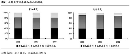 2005至2008年,西瓜霜系列和三金片系列銷量平穩(wěn),其中2007、2008年銷量增長受到產(chǎn)品大幅提價(jià)影響,銷售規(guī)模分別為4億元,已經(jīng)進(jìn)入成熟期。兩系列產(chǎn)品售價(jià)較低,價(jià)格有上漲空間。桂林西瓜霜是醫(yī)保乙類產(chǎn)品,出廠價(jià)和零售價(jià)有40%價(jià)差,西瓜霜清咽片和西瓜霜潤喉片是自主定價(jià)產(chǎn)品,未來西瓜霜系列增長需要靠各產(chǎn)品提價(jià);三金片是中成藥治療泌尿系統(tǒng)感染特色藥,進(jìn)入醫(yī)保甲類目錄,出廠價(jià)和零售價(jià)有40%價(jià)差,如果進(jìn)入基本藥物目錄,渠道拓寬可以求得量增但限制了價(jià)升,如果進(jìn)入不了基本藥物目錄,可以求得價(jià)升但量增會面臨一定困難,但公司二者只能得一;二線產(chǎn)品腦脈泰和眩暈寧片銷售規(guī)模上千萬,尚處于市場導(dǎo)入期。