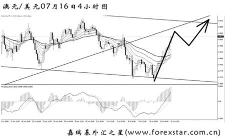 ▲澳元兌美元短線上升動能充足,預計匯價向通道上沿挺進的概率很大。中間會出現(xiàn)次要節(jié)奏調整,可尋找在調整內部做多澳元的機會。