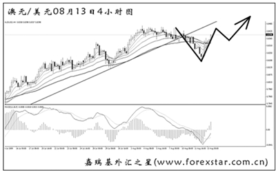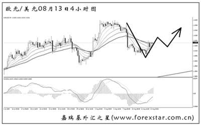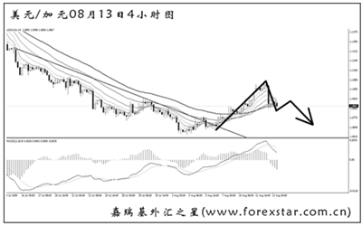 ▲美元兌加元匯價反彈上行,4小時圖道氏理論的最后一個顯著高點1.0935也被小幅升破,但中線跌勢沒有任何改變,操作上需尋找上方拋空的機會。