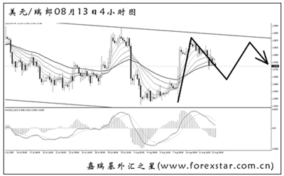 ▲美元兌瑞郎跌破大旗型中繼的下沿之后很快收起,是一次典型的假突破行為。匯價重新形成一個斜率平緩的下降通道,保持著橫盤震蕩的節(jié)奏。預計后市匯價仍將有一波上沖,但最終將在通道上沿的阻力下回歸跌勢。
