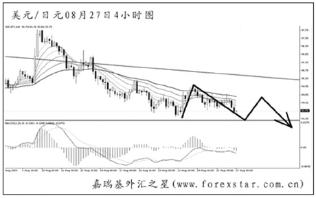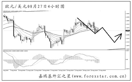 ▲歐元兌美元在高位形成了一個順勢楔形形態(tài),但斜率平緩,不直接構成反轉效果。短線走勢依舊反復無常,仍需以區(qū)間操作的思路對待歐元,預計后市匯價有重新下探1.4100下方的欲望,但跌破日線圖均線系統(tǒng)依托的希望不大。 |