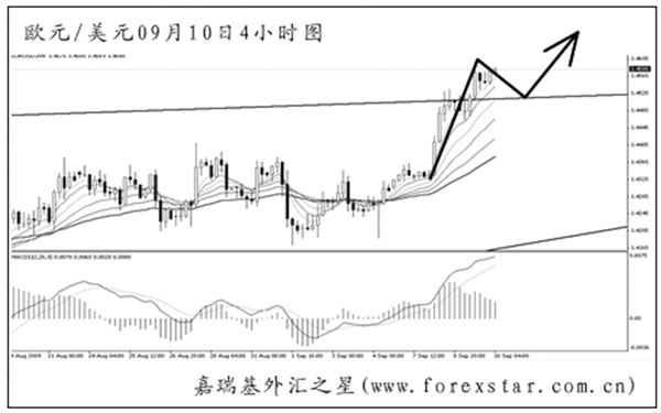 ▲歐元兌美元發(fā)力突破了前方高點(diǎn)1.4445的阻力,且日線圖形成的順勢楔形上沿也被小幅升破。上方的下一道阻力在去年底的高點(diǎn)1.4700,短線多單的目標(biāo)不宜超過此位。預(yù)計(jì)歐元將在大級(jí)別上升趨勢線的依托下繼續(xù)走高。 |
