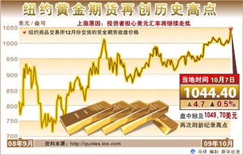 由于投資者擔(dān)心美元匯率將繼續(xù)走低,紐約商品交易所黃金期貨7日再次創(chuàng)下歷史新高,12月合約終盤上漲4.70美元,收于每盎司1044.40美元,漲幅為0.5%,盤中最高觸及1049.70美元,刷新了6日創(chuàng)下的1045美元的紀(jì)錄高點(diǎn)。