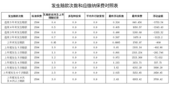 同樣是這輛車(chē),如果其它條件不變,今后4年內(nèi)不出險(xiǎn),到第5年時(shí)保費(fèi)將下浮至840.46元,節(jié)省保費(fèi)1753.54元,中間年度應(yīng)繳納保費(fèi)詳見(jiàn)左表;同樣,如果這輛車(chē)上一年度發(fā)生1次賠款,最終費(fèi)率浮動(dòng)系數(shù)為0.81(1.0×0.9×0.9),應(yīng)交納保費(fèi)2101.14元;隨著發(fā)生賠款次數(shù)的增加,保費(fèi)將出現(xiàn)不同程度的上浮,如發(fā)生8次及8次以上賠款,最終費(fèi)率浮動(dòng)系數(shù)將上浮至2.43,應(yīng)交納保費(fèi)6303.42元,比標(biāo)準(zhǔn)保費(fèi)上浮3709.42元。