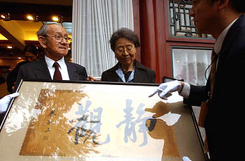 2004年9月15日,毓嶦老先生(左一)將珍藏的一幅恭王府字畫遞交到工作人員手里,這幅字畫是恭王府管理中心獲贈(zèng)的第一件王府文物。新華社記者 李石磊