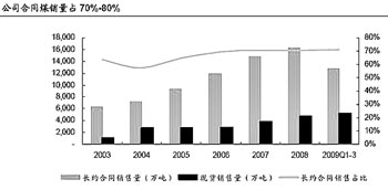 1、2009年產(chǎn)銷量將大幅超過計(jì)劃量,四季度增長值得期待。公司前三季度商品煤產(chǎn)銷量分別完成計(jì)劃的80.6%和85.4%,同比增長15.2%和10.4%。四季度是動(dòng)力煤的傳統(tǒng)旺季,加上經(jīng)濟(jì)復(fù)蘇對(duì)煤炭的需求增長,預(yù)計(jì)四季度煤炭產(chǎn)銷量同比將繼續(xù)增長,超過全年計(jì)劃。 2、在建礦是未來三年內(nèi)生性增長的主要來源。公司的自產(chǎn)煤炭業(yè)務(wù)未來仍具很大的增長潛力。近3年內(nèi),公司建設(shè)的煤礦有較為明確的增產(chǎn)預(yù)期:布爾臺(tái)煤礦、哈爾烏素露天礦、勝利一號(hào)露天礦、黃玉川煤礦將在2009年-2011年陸續(xù)全部投產(chǎn),四個(gè)煤礦的設(shè)計(jì)年產(chǎn)量達(dá)到了6500萬噸。布爾臺(tái)礦和哈爾烏蘇礦錦界產(chǎn)能大量釋放。 3、五年內(nèi)增長確定,新街和榆神項(xiàng)目將增加2億產(chǎn)能。公司未來主要增長來源是兩個(gè)億噸級(jí)礦區(qū):新建內(nèi)蒙古新街和陜西榆神兩個(gè)億噸級(jí)礦區(qū)。目前,兩項(xiàng)在實(shí)施前期準(zhǔn)備工作,預(yù)計(jì)可新增儲(chǔ)量200多億噸。這兩個(gè)項(xiàng)目未來有望分別貢獻(xiàn)1億噸的產(chǎn)能,兩個(gè)礦將于2013年投產(chǎn),2015年達(dá)產(chǎn)。 |