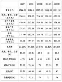 公司主營業(yè)務(wù)收入呈“333”結(jié)構(gòu),旅游、貿(mào)易、傳媒各占約30%的結(jié)構(gòu),由于貿(mào)易相對于旅游與傳媒業(yè)盈利能力明顯偏低,公司利潤貢獻格局重新分配,傳媒業(yè)務(wù)貢獻公司利潤50%左右,旅游業(yè)利潤占利潤總額的45%左右。公司旅游業(yè)務(wù)包括觀光,餐飲等全方位的旅游服務(wù),傳媒業(yè)務(wù)主要以上海地區(qū)新媒體、廣告、通訊及傳輸業(yè)務(wù)為主的多元化傳媒業(yè)務(wù)結(jié)構(gòu)。未來公司發(fā)展的方向仍將是多元化旅游業(yè)務(wù)、多元化傳媒業(yè)務(wù)并重的發(fā)展道路。 世博會期間預(yù)計公司旅游觀光人數(shù)將增加1000萬人次,同時人均消費也將提升約9元,旅游觀光業(yè)務(wù)收入增加約9000萬元;賓館業(yè)務(wù)由于2009年出租率及單位房價比較低,2010年也會有較大增長;浦江游船業(yè)務(wù)在世博會期間將實現(xiàn)東方明珠碼頭與世博演藝中心兩個景點互開,世博演藝中心是世博會后唯一的一個靠江的場館,兩個碼頭相連后,不僅游船業(yè)務(wù)將有望實現(xiàn)翻倍增長,同時也間接提升兩個景點的觀光人數(shù);世博演藝中心是世博會惟一一家參與場館運營,世博演藝中心目前擁有80多個包箱,世博會期間將賣出50多個,將直接增加2010年的收入,世博演藝中心將保證一年約200場演出、10.5億的廣告收入。公司目前已與長三角地區(qū)旅行社建立起良好的關(guān)系,公司旅游觀光與世博會及其后續(xù)場館經(jīng)營將成為公司投資的最大亮點。