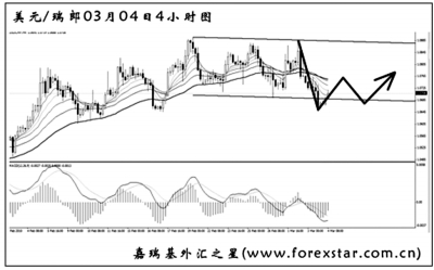 ▲美元兌瑞郎盤整區(qū)間的下沿被小幅跌穿,匯價有形成階段性頂部的希望。圖中的客觀趨勢橫盤,從大級別趨勢上看,美元兌瑞郎仍有接續(xù)上沖的欲望,但4小時圖多頭動能持續(xù)減弱,后市有發(fā)生明顯回調(diào)的風險。若匯價成功跌破1.0600,可轉(zhuǎn)為看空的思路。